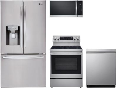 LG 4 Piece Stainless Steel Kitchen Package with French door refrigerator, freestanding electric range, built in dishwasher, and over the range microwave.Read More